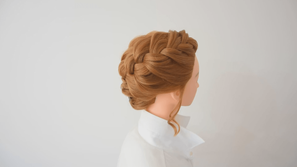 dove, partendo dai lati della testa, ho realizzato due trecce che si raccolgono insieme nel retro creando un raccolto morbido ed elegante.