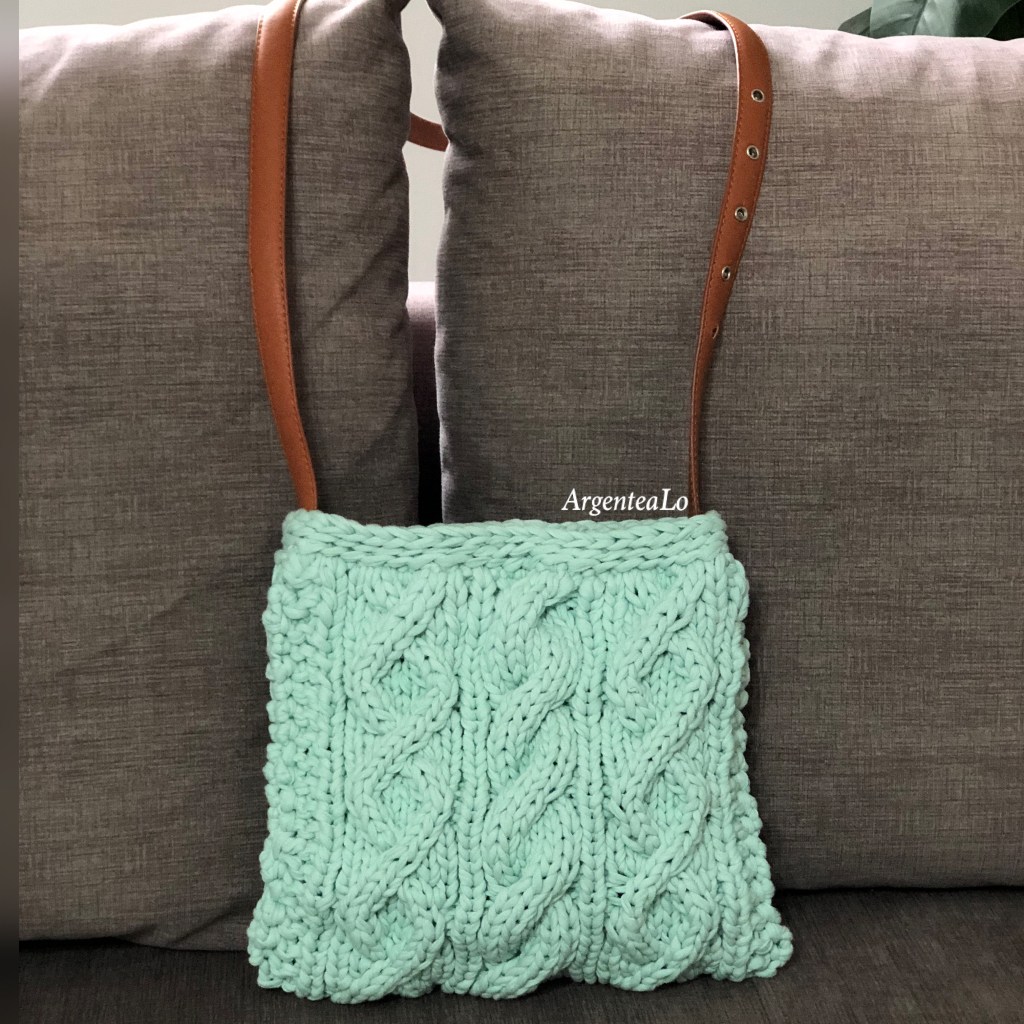 Per la borsa verde ho utilizzato i ferri e ho creato trecce e rombi che danno movimento e ritmo. Perfetta per un uscita con le amiche, per una sera in pizzeria o in discoteca.
