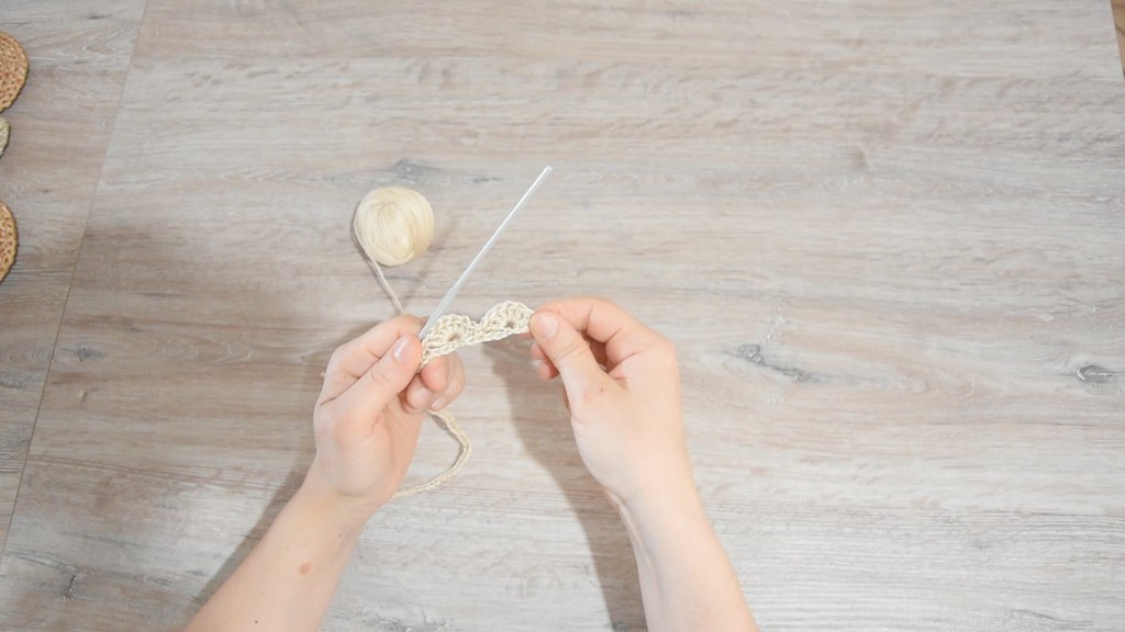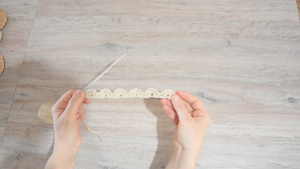Avviamo 78 catenelle, saltiamo 2 catenelle e inseriamo l’uncinetto nella terza catenella e facciamo 6 maglie alte sempre nella stessa catenella poi saltiamo altre 2 catenelle e inseriamo l’uncinetto nella terza catenella facendo una maglia bassa ottenendo un ventaglio. Ripetiamo questi step ma dal secondo ventaglio facciamo 7 maglie alte per tutta la lunghezza.
