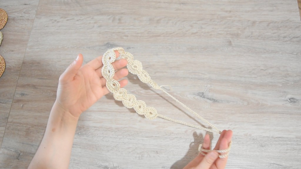Arrivati al capo opposto facciamo altre 7 maglie alte nella stessa catenella facendo andare il lavoro nel lato inferiore e creando un cerchio. Proseguiamo il lavoro come nel lato superiore inserendo l’uncinetto nelle stesse catenelle in cui lo abbiamo inserito per i ventagli superiori e quando abbiamo realizzato tutti i cerchi realizziamo delle catenelle ai lati esterni così da creare i cordoncini per fissare la fascia.