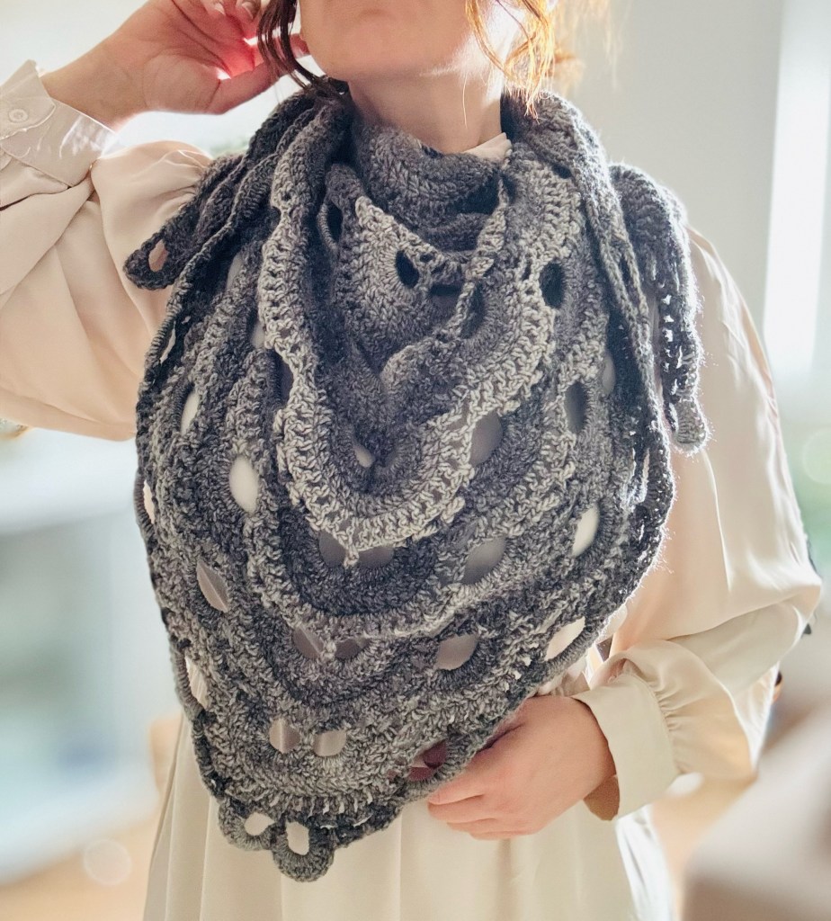 Lo scialle triangolare lavorato a punto virus è un capo molto versatile, perfetto come copri spalle sopra un vestito elegante fermato sul davanti con una spilla o un fermaglio oppure può essere indossato anche come sciarpa sopra a una giacca, un cappotto o un piumino.