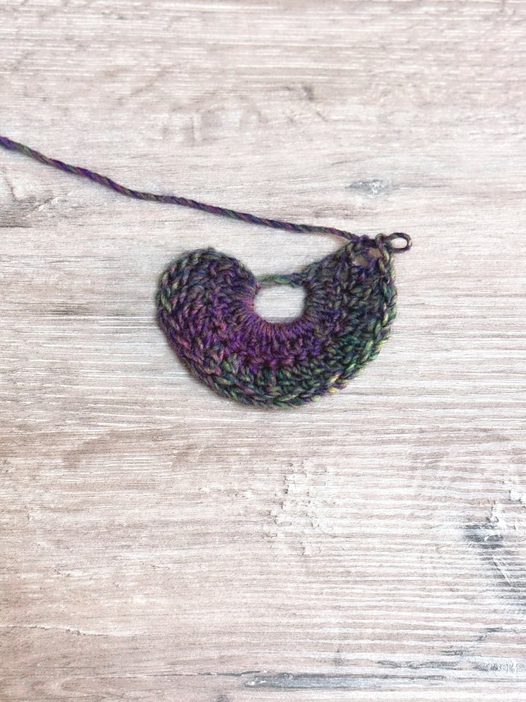 Fare 10 catenelle, chiuderle a cerchio con 1 maglia bassissima, fare 3 catenelle che contano come 1 maglia alta e all’interno del cerchio fare 19 maglie alte che sommate alla maglia alta precedente fanno 20 maglie alte che non le chiuderemo in cerchio ma le raggruppiamo così da avvicinarci quanto più possibile ad un semi cerchio.