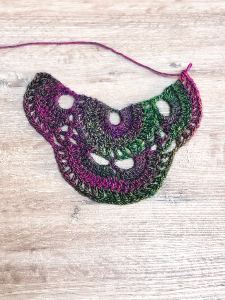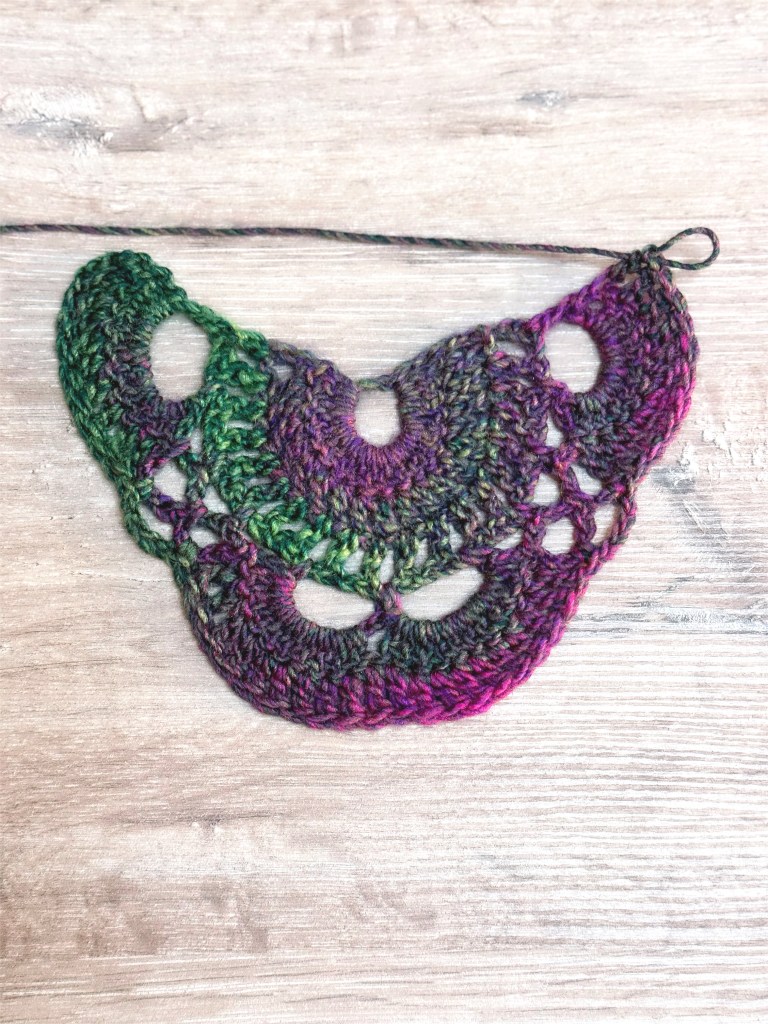 Adesso facciamo il giro degli archetti con gli aumenti e ripetiamo gli ultimi 3 giri. Procediamo fino ad ottenere la lunghezza desiderata.